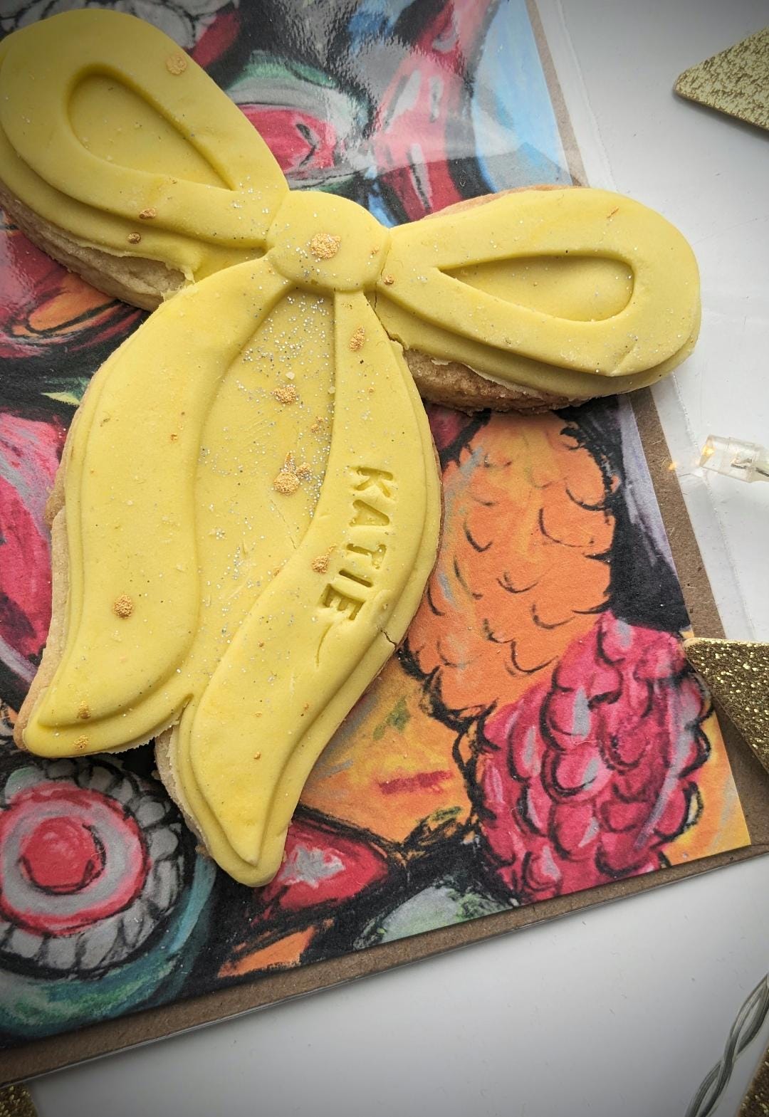 You can choose your colour of bow you would like and we can personalise your biscuit with a name of your choice, making iot a really thoughtful and tasty gift!