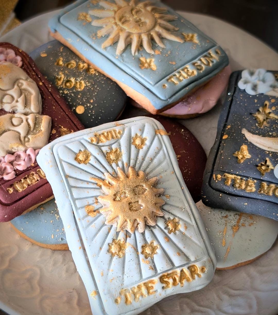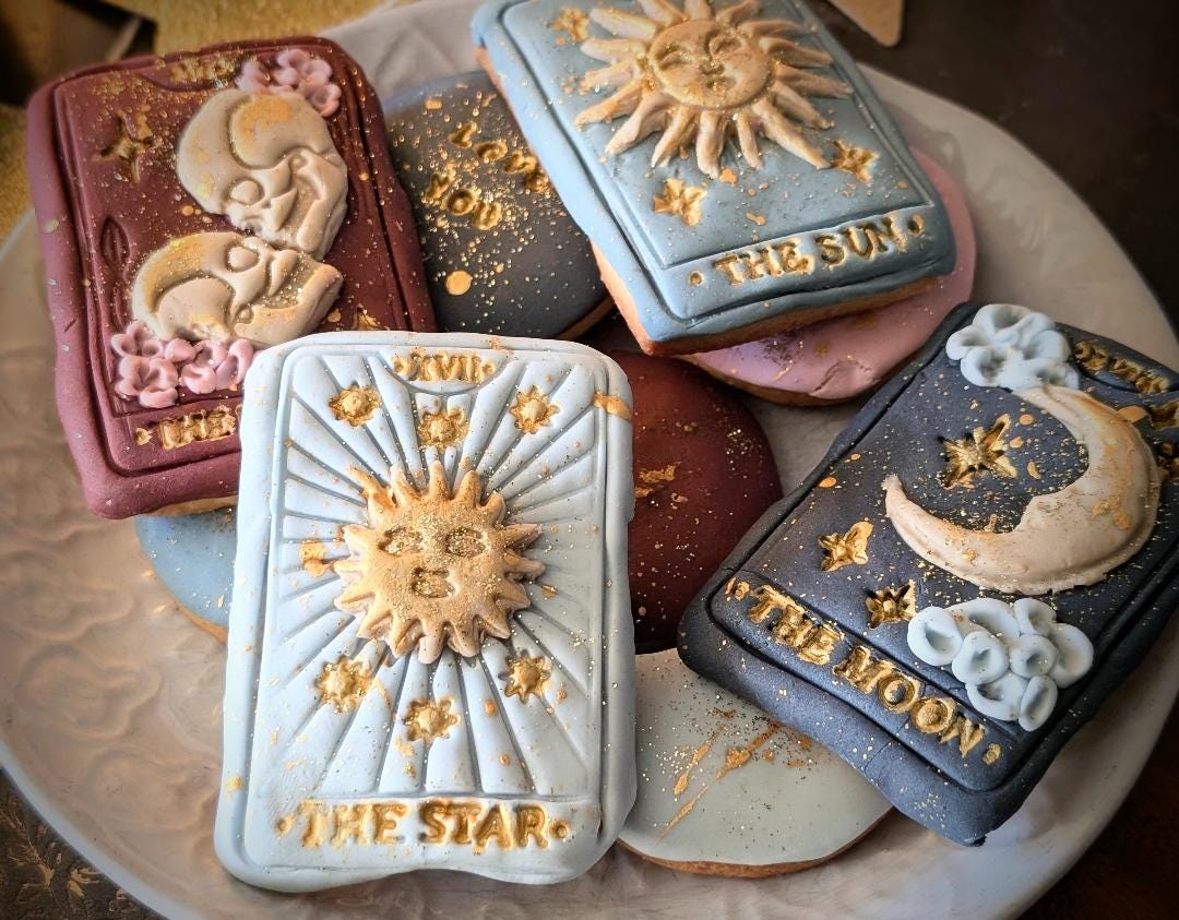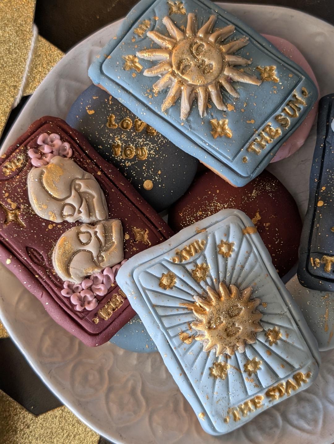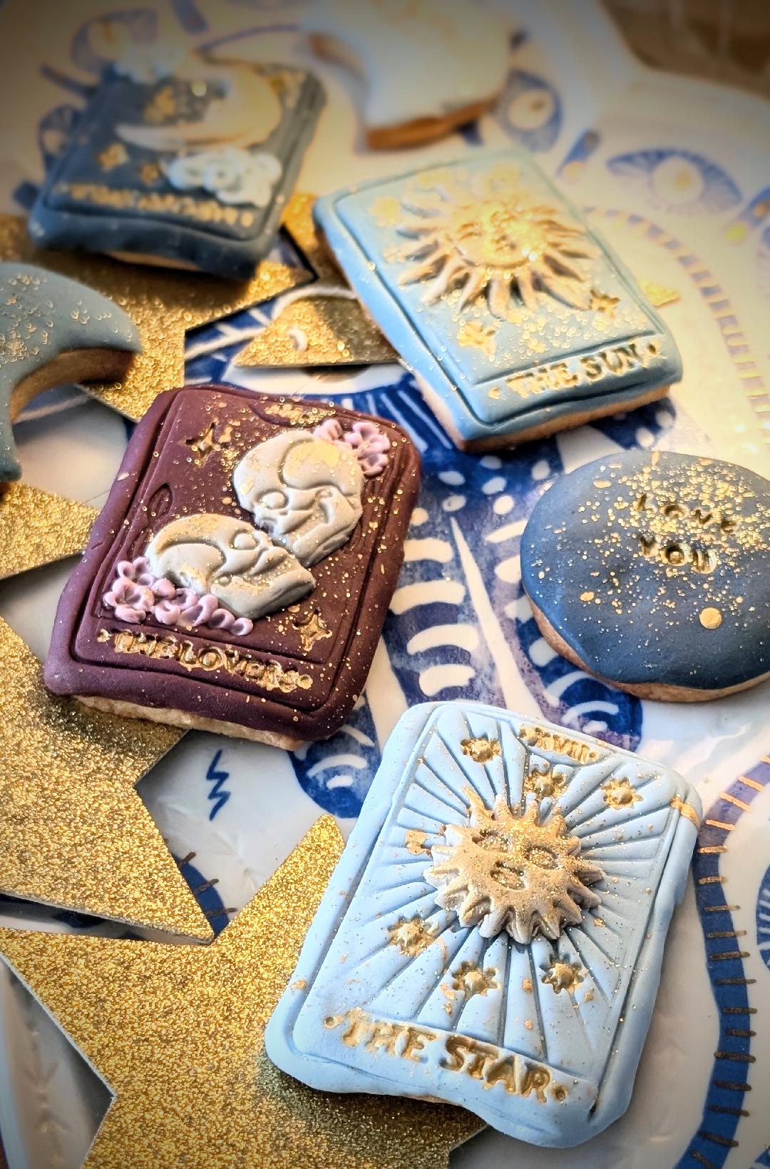 Indulge in a touch of magic with our hand-iced tarot card/celestial themed biscuits. Each Biscuit is carefully baked and decorated by hand, featuring intricate designs inspired by the mysticism of tarot, the moon, stars and the cosmos. Made with high-quality ingredients and fisnhed with beautifully detailed fondant icing, these biscuits are as delicious a they are enchanting. Perfect for spiritual celebrations, astrology lovers, as unique gifts or adding a little celestial magic to your special occasion. Every set is lovingly crafted to br both a feast for the eyes and a sweet treat to enjoy.