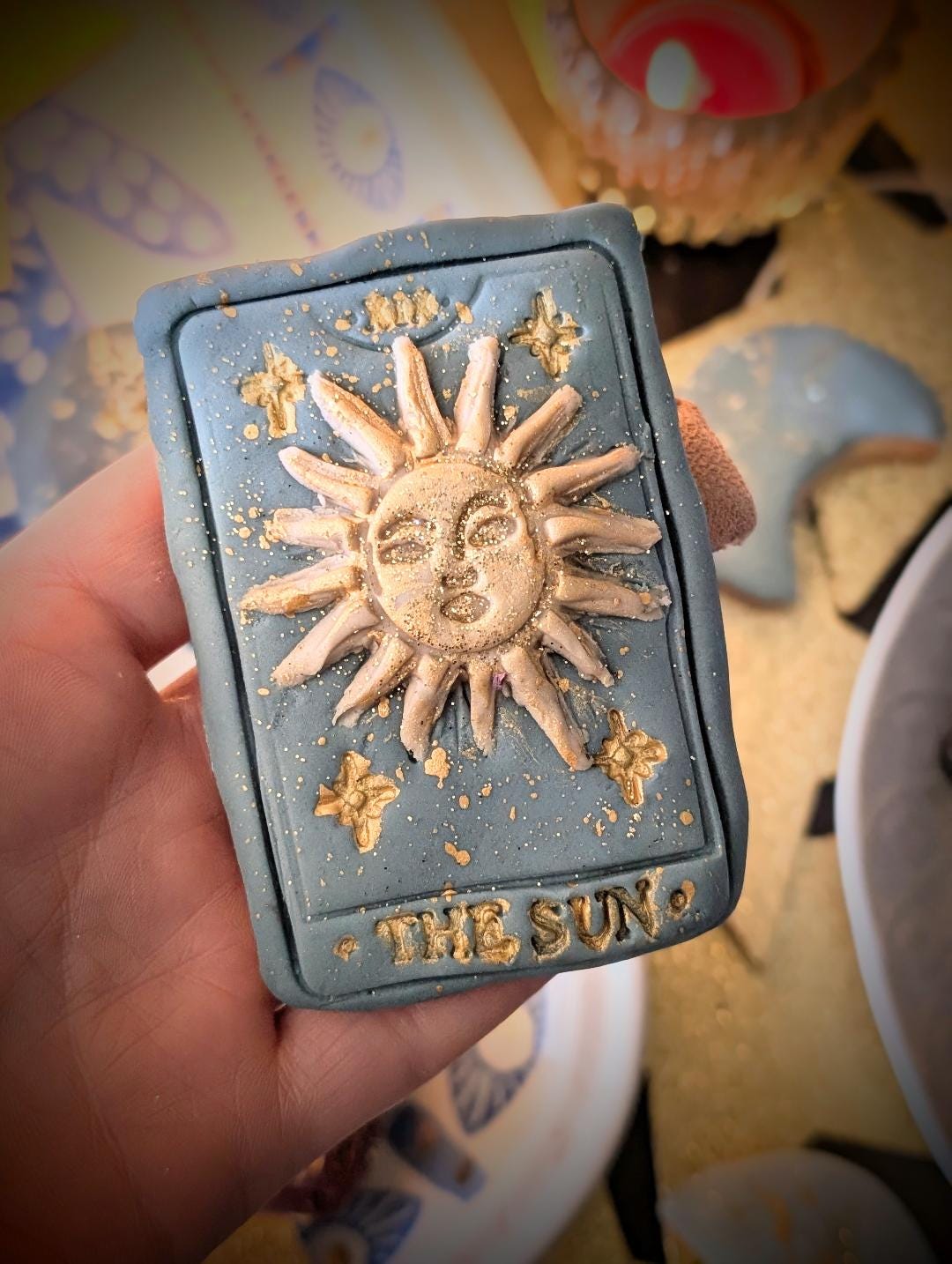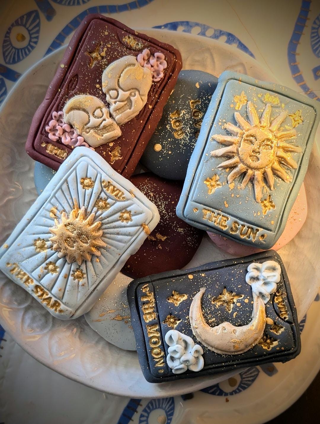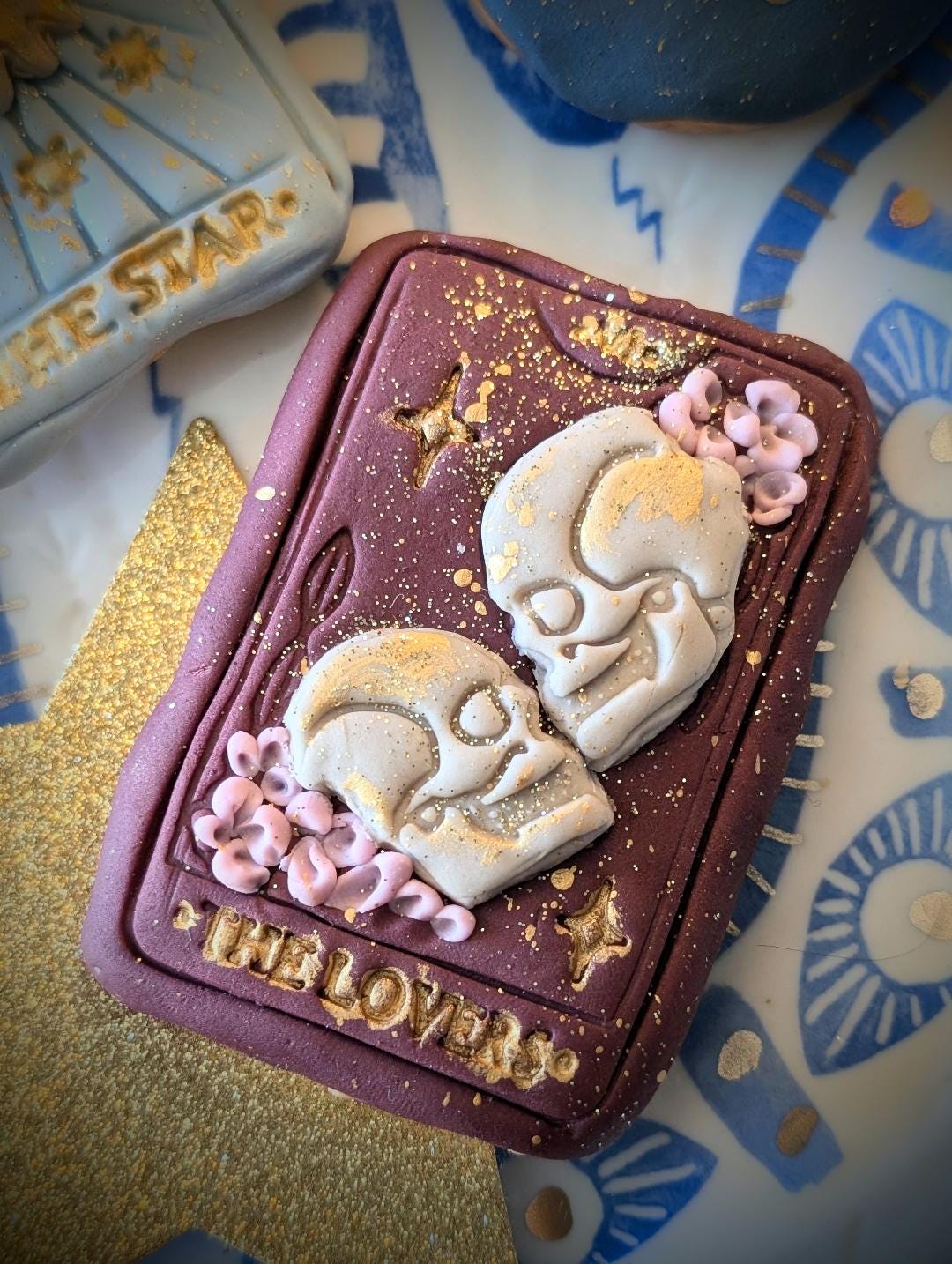 Indulge in a touch of magic with our hand-iced tarot card/celestial themed biscuits. Each Biscuit is carefully baked and decorated by hand, featuring intricate designs inspired by the mysticism of tarot, the moon, stars and the cosmos. Made with high-quality ingredients and fisnhed with beautifully detailed fondant icing, these biscuits are as delicious a they are enchanting. Perfect for spiritual celebrations, astrology lovers, as unique gifts or adding a little celestial magic to your special occasion. Every set is lovingly crafted to br both a feast for the eyes and a sweet treat to enjoy.